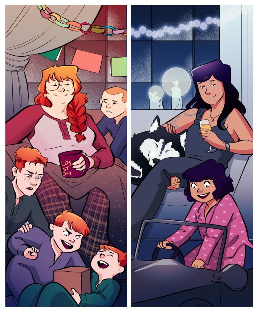 Motherlove is the second kind of thing. Iron Circus Comics sent me the first print collection of the fan-favorite webcomic series, and I really wish I had been along for the ride since the beginning. Lindsay Ishihiro put out the comic from 2017 to 2024. It tells the story of Imogen and Alex, a pair of suburban moms who have a meet-cute on the first day of their kid’s school, which launches them into a friendship and burgeoning romance.